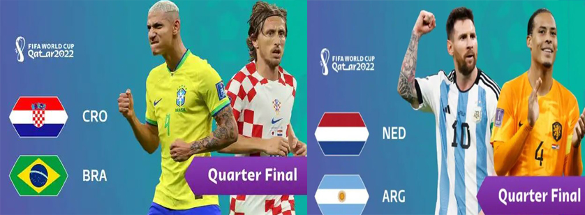 कतारमा जारी फिफा विश्वकपको क्वाटरफाइनल अनतर्गत आज दुई खेल हुँदैछ। पहिलो खेलमा ब्राजिलले क्रोएसियाविरुद्ध एडुकेशन सिटि रंगशालामा राति ८:४५ बजे खेल्नेछ।