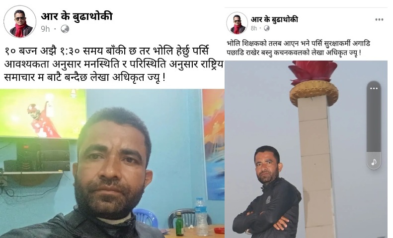 शिक्षक बुढाथोकीले फेसबुकमा लेखेका थिए, “भोली शिक्षकको तलब आएन भने पर्सी सुरक्षाकर्मी अगाडि पछाडि राखेर बस्नु कचनकवलको लेखा अधिकृत ज्यू” साथै उनले “अझै १० बज्न समय रहेछ, लेखा अधिकृत गोबिन्द रिजाल ज्यू, तर अब के गर्छौ ? म त पागल हो,” जस्ता अभिव्यक्तिहरू सार्वजनिक गरेका थिए ।