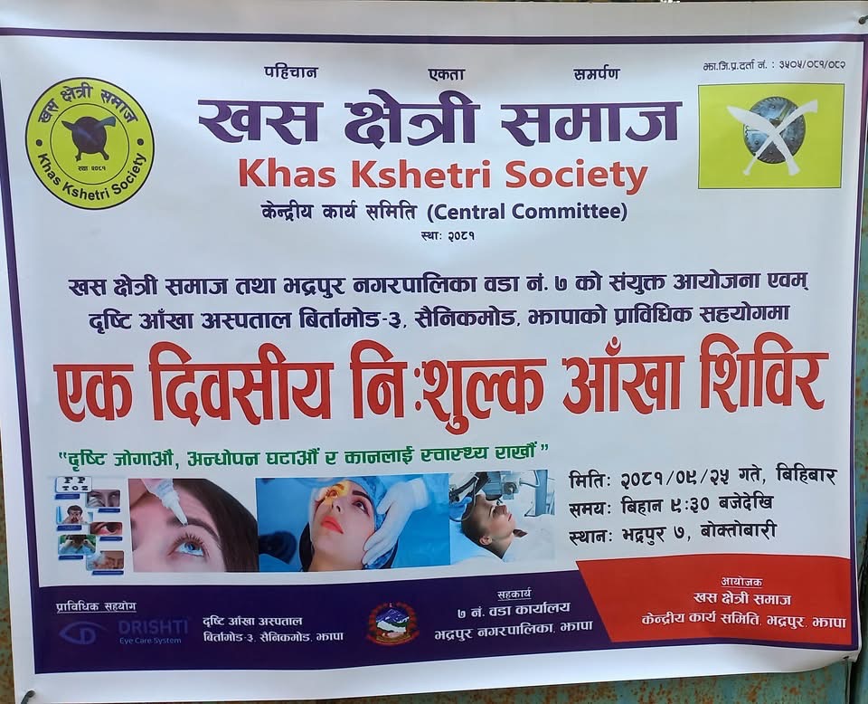 झापा।भद्रपुर ७ स्थित सरस्वती आधारभूत विध्यालयमा आज एकदिने आँखा तथा कान शिविर सम्पन्न भएको छ ।भद्रपुर नगरपालिका वडा न. ७ र खस क्षेत्री एकता समाजको आयोजनामा शिविर सम्पन्न भएको हो