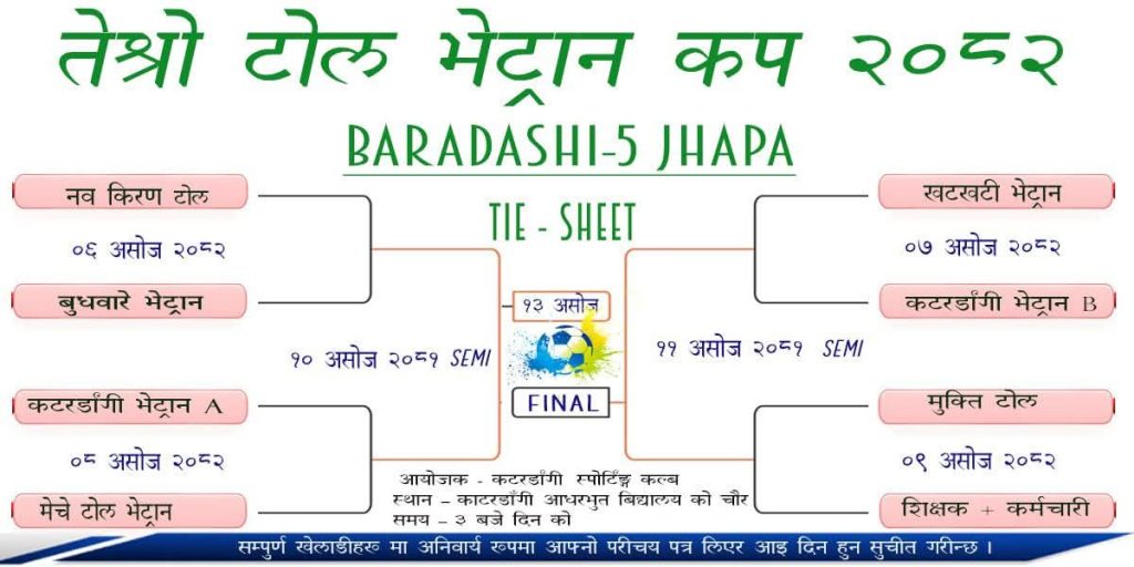 झापा । झापाको बाह्रदशी–५ स्थित कटरडागी आ.वि.को खेलमैदानमा आजदेखि तेश्रो टोल स्तरीय भेटेरन कप २०८२को औपचारिक शुरुवात भएको छ । बर्षौनी चाडपर्वको अवसर पारेर आयोजना हुँदै आएको यस प्रतियोगिता यसपटक तेस्रो संस्करणमा प्रवेश गरेको हो । सुरुदेखि नै स्थानीय खेलप्रेमीहरूको बाक्लो उपस्थिति रहेकाले खेलमैदानमा उत्साह र जोशजामको वातावरण सिर्जना भएको थियो ।